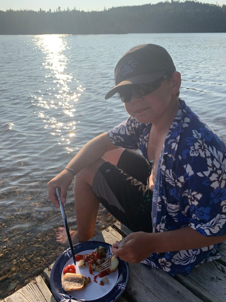 No more ensuites with luxurious soaker tubs for me – only special opportunities like the one laying in front of me that day. As the fire warmed the water, I picked wildflowers to float in place of bubbles. It was divine! The view looking over the water across the bay while I soaked was so lovely. After I was shampooed, washed and rinsed we emptied and filled it two more times for my guys. We stayed there the rest of the day. Over an open fire we cooked up potatoes and the two trout the guys caught. We ate our supper sitting on a little wooden dock with our plates on our laps and our feet in the water.