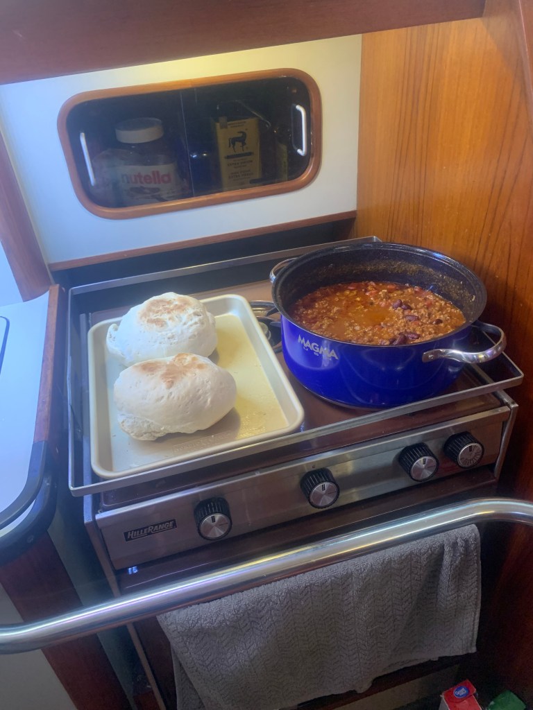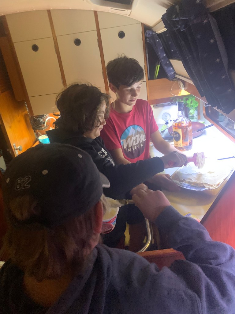 When it came time to leave Kingfisher, we had to leave Surprise behind as they had unfortunate mechanical issues. Brian continued with us but not for long. His engine died after the lock and he got towed back. This last stretch of the rivers is known for being tricky with long distances between anchorages and not many good anchoring options. We did well though and enjoyed meeting some new people. That first night, we invited Brigid and Wayne on their boat Penguin to raft up to us. We enjoyed sipping wine and beer on their boat as we got to know one another. Dylan baked us all delicious peanut butter cookies.
