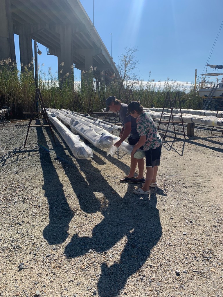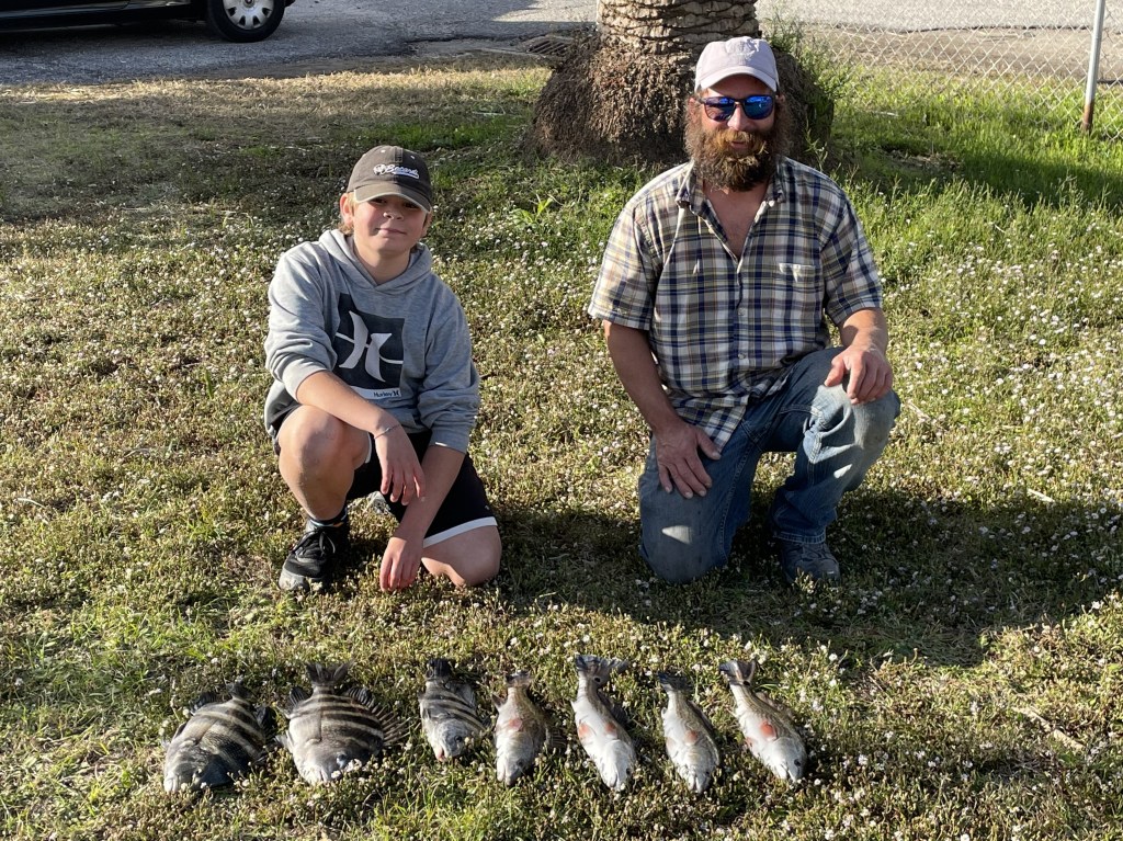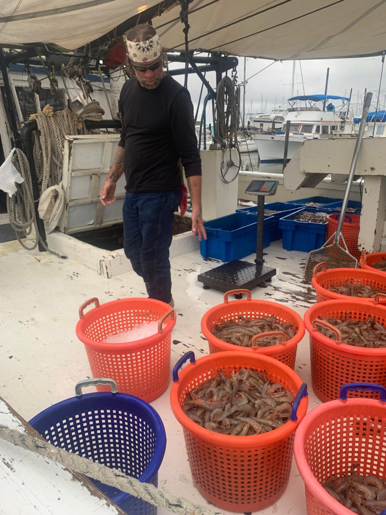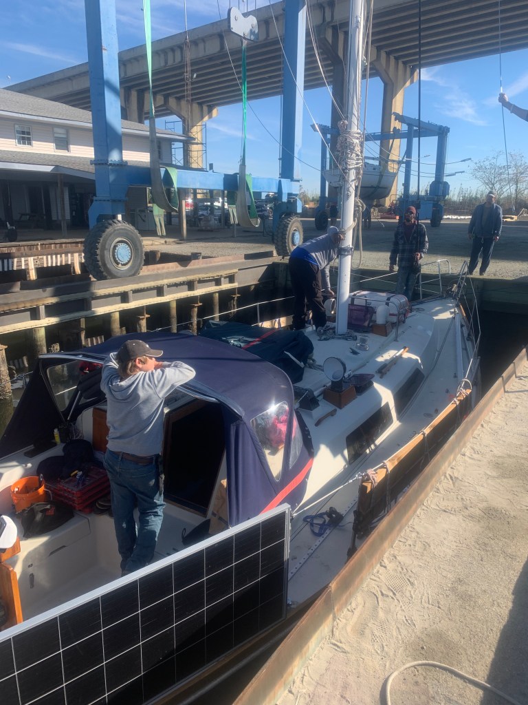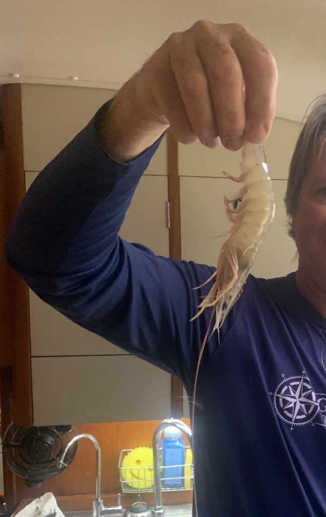 We’ve done a lot since arriving at Turners here in Mobile on November 24th. The most exciting part was getting our mast up. We then put on the jib sail and boom before Jas hoisted me up the mast to tune the rigging. Finally, we are a sailboat again! We are now awaiting the delivery of our mainsail which should be here by December 7th. There are also two shrimp boats that come and go out of here regularly and they sell shrimp! We bought some the other day and it was delicious! 3.5 lbs of massive sized shrimp for $10! We are going to do it again before we leave. Dylan has also had some great success fishing with a new, fast friend, Adam. Using some of the live shrimp they caught sheepshead, red drum and black drum. Adam joined us on Starship that night as we cooked up a seafood feast using their catch and fresh shrimp. It was also the same day the mast went up so we popped open some champagne to celebrate!