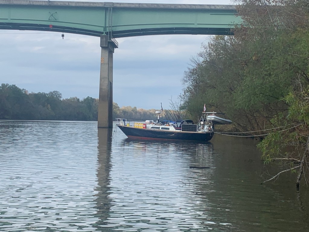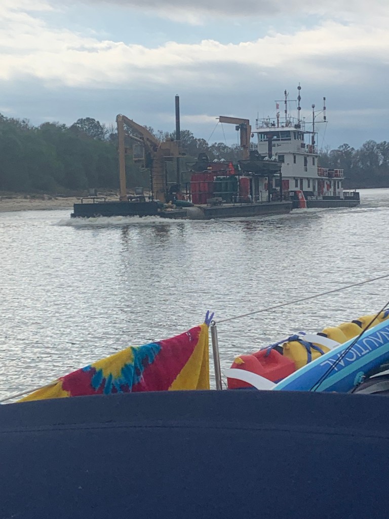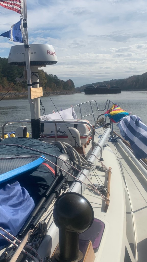 We had planned on pushing off the rivers on November 23rd but an unexpected train bridge changed that plan for us. It was a low bridge, very low, so we had to wait for a train to pass so that it can be opened to allow us, a barge and four other boats to pass through.  By the time we got through the bridge we saw that we would not be able to get to our marina in Mobile until after dark. That’s fine and that night we dropped our anchor at Big Briar anchorage before completing our journey on the rivers the following day.