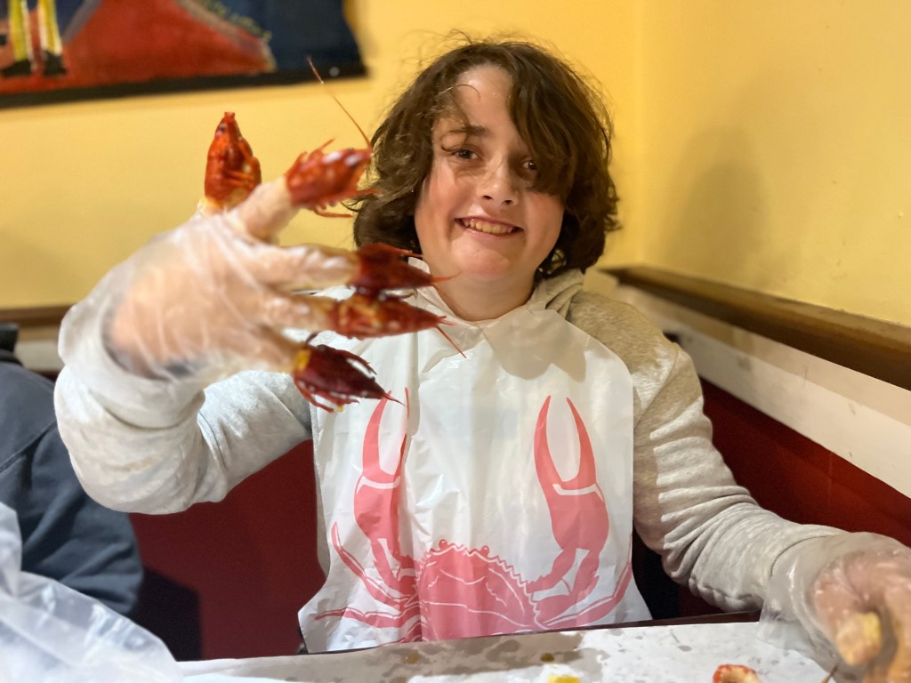 Leaving Grand Harbour Marina, we got another several days of travel and locks under our belts. We loved the river stretch that took us to Columbus as we were treated to a bit of an airshow as a ton of military planes flew over that afternoon. Arriving at Columbus, Surprise and Wandering Winnie went to the marina and we decided to anchore close by instead. We were close enough to dingy into the marina so that arrangement worked out nicely. With Surprise, we treated ourselves to a unique (but messy) dining experience! We went to Breaux Bridge Restaurant where they bring your dinner to you in a bag as you put on a bib and plastic gloves. Doesn’t sound very desirable, does it? It was fantastic though! We ate our Louisiana style, savoury mess of shrimp, crayfish, crab legs, corn on the cob and potatoes right out of the bags with our hands!  The kids delighted themselves by putting crayfish heads on their fingers. Oh, boys will be boys!
