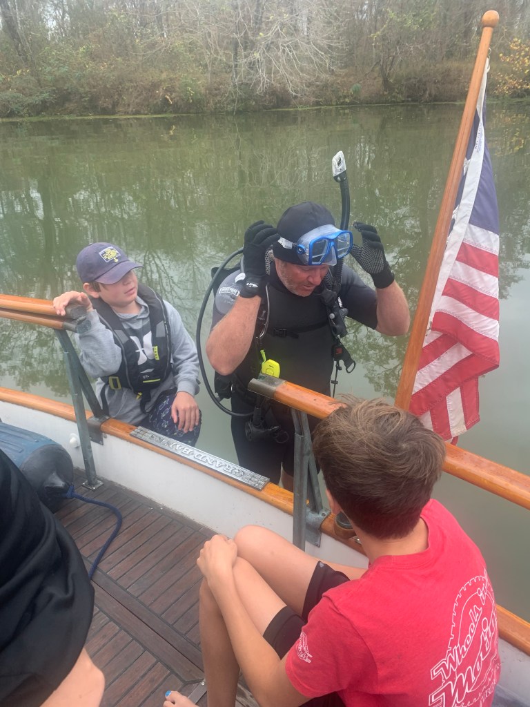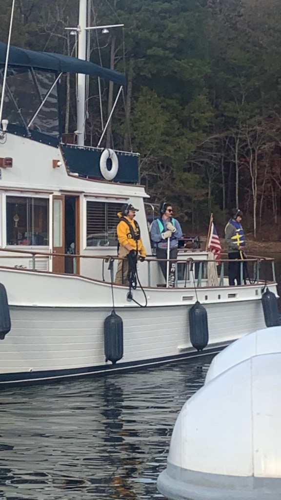 Us and Brian did everything to help Ryan raise that anchor. After many attempts to use our boats to pull the anchor line in various ways we concluded there was something huge holding it down. Jason, being a certified scuba diver, is always open to participate in one of his favourite hobbies so before we knew it he was pulling out all his gear. Once in the water (and me watching closely for alligators!) he discovered the anchor chain was in fact securely wrapped around a large log. He got it unwrapped and soon we were all cheering as Surprise’s anchor finally gave in and allowed itself to be brought back up on to the bow. Maureen’s fingers were still quite swollen but were not changing colour so continuing with ice therapy we started our travel day. You’d think that would’ve been enough excitement for one day but, nope! That day we had one lock to go through. All started as per normal with each of us on our own bollards. Wandering Winnie and Surprise on the port side with us on the starboard side. Dylan and I were up on the bow as the lock started draining water when we looked back and saw quite a sight! Wandering Winnie was listing really far over away from the wall! My brain immediately thought he was sinking before all of us (including the Lock Master) realized what was actually happening. The bollard malfunctioned and stopped dropping! That meant as the water continued to drop (at a decent speed) Brian’s boat did not drop. As the Lock Master yelled at him to quickly cut the line, the line broke and his boat came crashing down into the water. As it did, Dylan caught a glimpse of his keel which is never a good thing. Fortunately, there was no damage to the boat. Brian and his dog Rako were rattle but just fine. At that point we had all done so many locks that we were starting to get complacent. We’d secure our bollard and chill, chat, take pictures or drink our coffee as we dropped. This experience was a reminder to continue to be very vigilant as anything can happen in those locks. The idea of one malfunctioning never occurred to me. Yikes!