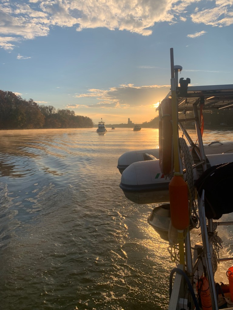 The next morning had its challenges to say the least. All started out alright as we were the first ones to get underway just after sunrise. About ten minutes later Ryan radioed saying he couldn’t get his anchor up. We had been warned that this part of the river was bad for hooking underwater trees. We turned around to see what we could do to help. Unfortunately, in their initial attempt to raise the anchor Marueen injured her hand. She squished two fingers including her ring finger. Immediately swelling up, her ring would not come off. Quickly wrapping her hand in a bandage with lots of ice we split our focus between the anchor situation and making sure her finger situation didn’t escalate.