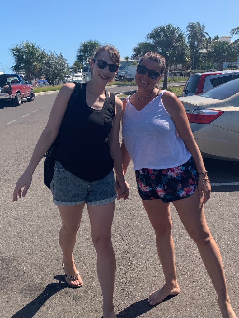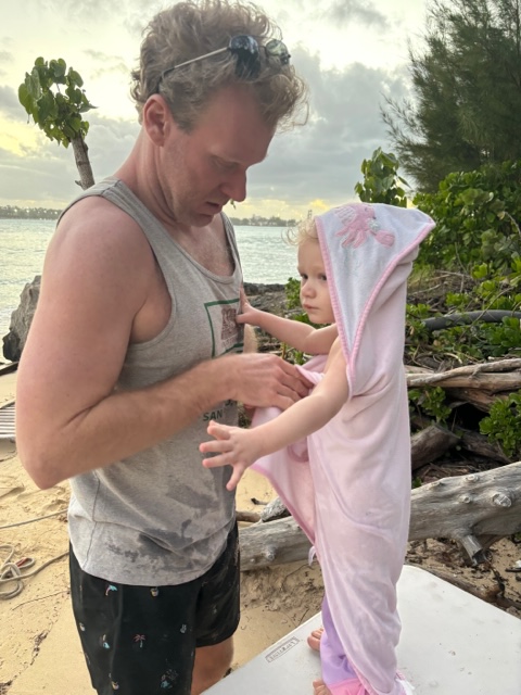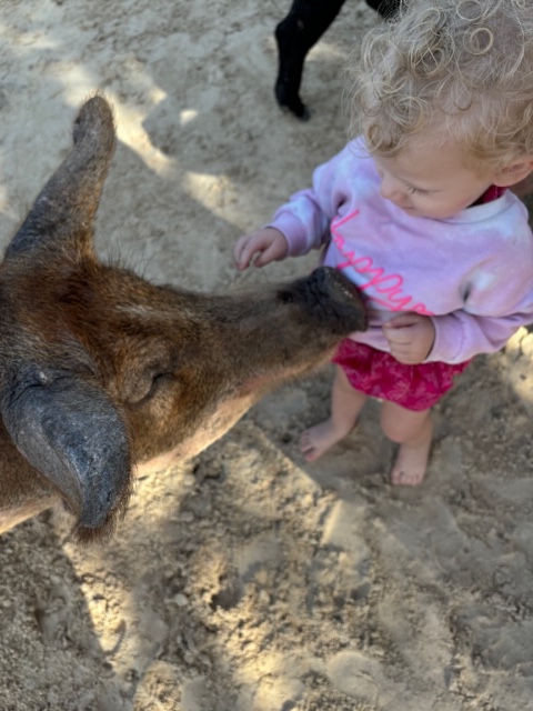We had them for eight days and quickly settled into a routine of splitting our time with them between Starship and their Airbnb. After Tessa confessed that petting the wild Bahamian pigs was on her ‘bucket list’ we knew we had to make it happen! Picking up the hook we made our way out of Nassau Channel towards Rose Island. Navigating shallow waters and uncooperative winds we had to motor to the island. That caused Starship to move in ways that are not always favourable to someone not used to being on a sailboat. Poor Tessa got seasick but very shortly after anchoring and getting her toes in the sand, she felt fine. Delightfully her stomach behaved for the rest of our sail day.