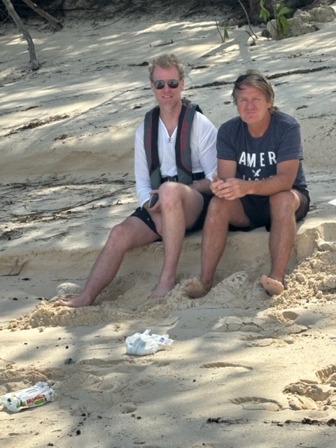Over on Rose Island, the first two beaches with pigs we found were private. We were not allowed to go to shore to pet the pigs. Darn, ‘operation find pigs for Tessa was going to be a challenge’! I spoke to a restaurant owner who described exactly which beach we should head to. Soon the sails were up and our bow was pointed to Athol Island. Success! We found wild pigs to frolic with as Tessa checked a box off of her bucket list! We were also happy that we were eventually able to put sails up that day. They both loved it but I will always remember how big Kevin was smiling once our white canvas triangles were full of wind and the engine was finally off.