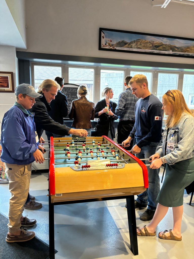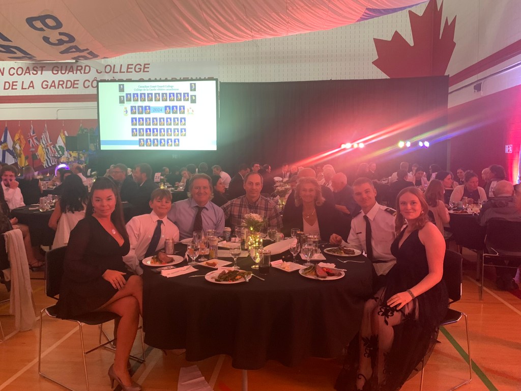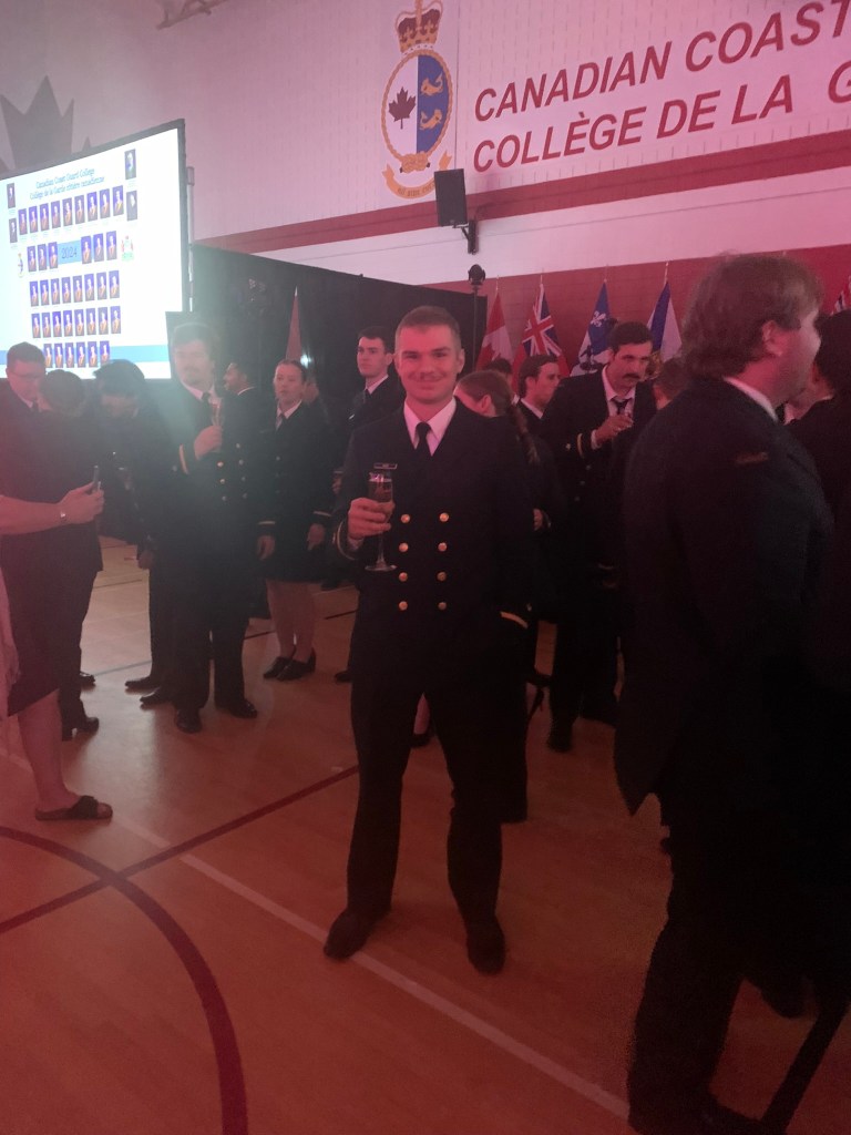 The ceremony was long but wonderful. The speeches given by dignitaries of the college were meaningful and well presented. Their words emphasized the intense training each cadet went though both in the classroom and at sea phase. Their words also highlighted the strong bond the class of 2024 developed. The valedictorian’s speech had everyone laughing. Looking over at Alex and seeing him almost crying with laughter, we knew there were parts of the speech that were based on ‘inside stories’ only he and his classmates knew. Before we knew it, it was the moment we had all been waiting for. It was Alex’s turn to walk across the stage to receive his Nautical Sciences degree from the University of Cape Breton along with his Transport Canada diploma. We could not have been more proud of him in that moment. It was emotional to see them all stand at attention again for the Chief Cadet Captain to announce their dismissal for the final time before the grads threw their hats up into the air…one was even successful at getting hung up in a spinnaker sail hanging from the ceiling.