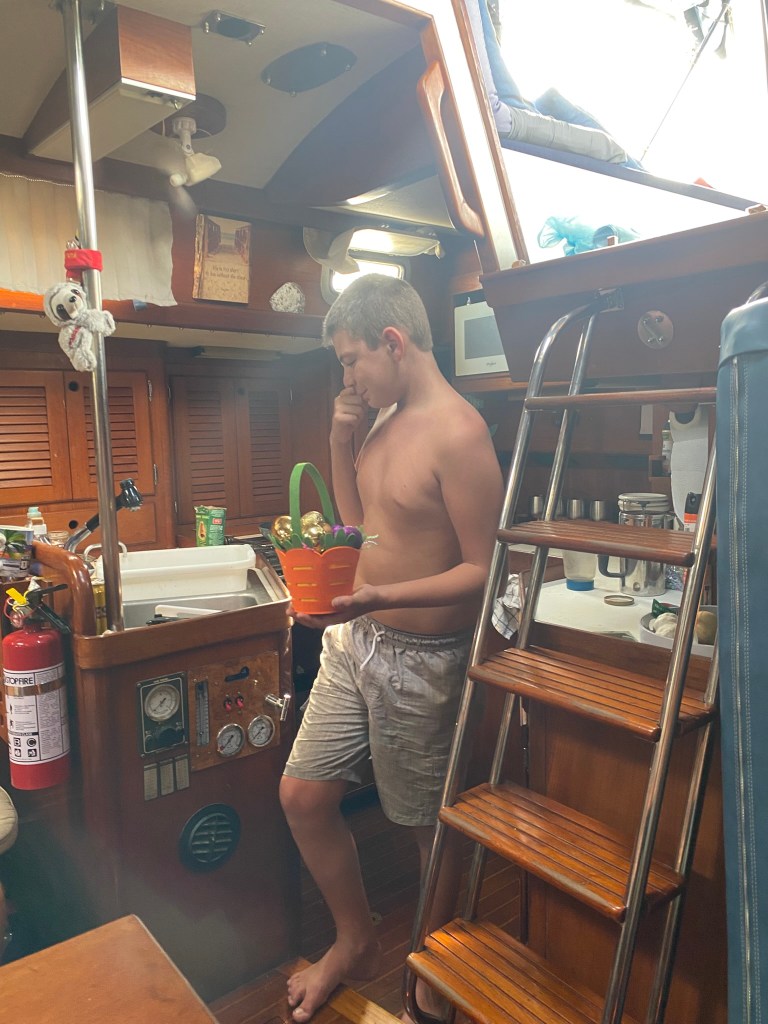Blan returned to Morning Stars just in time for Easter! Dylan was thrilled that the Easter bunny found us this year as last year we totally missed it. We were in a remote area of the Bahamas at the time and did not prepare in advance for Easter. We had no chocolate onboard and there were no stores around. Fortunately we were about to set sail to Georgetown so the Easter bunny got him a big ice cream as soon as we got there!π¦
